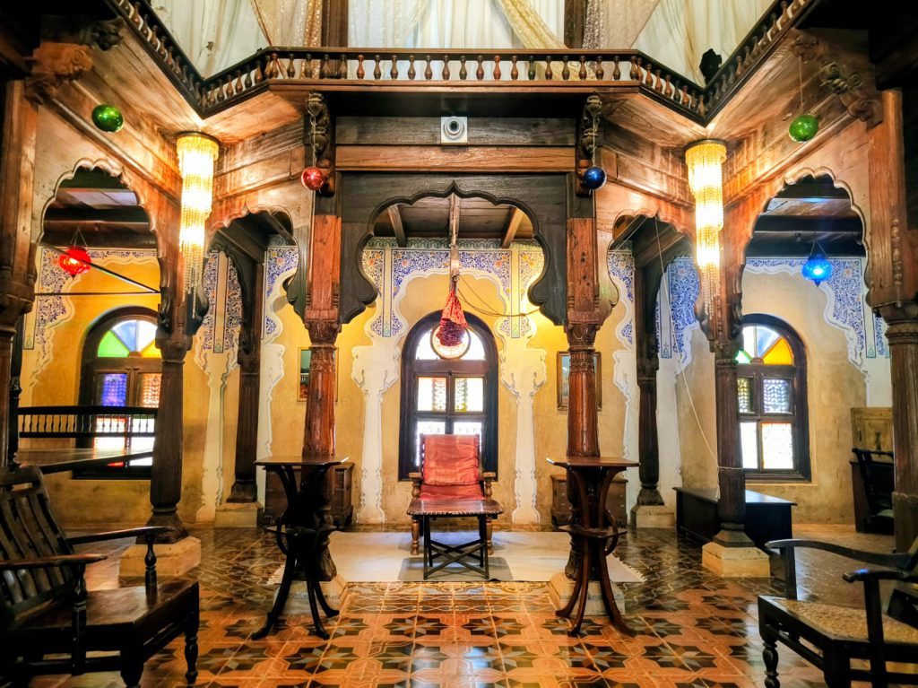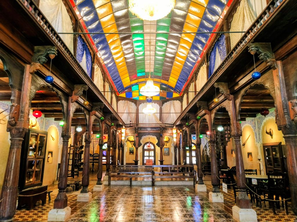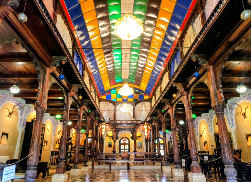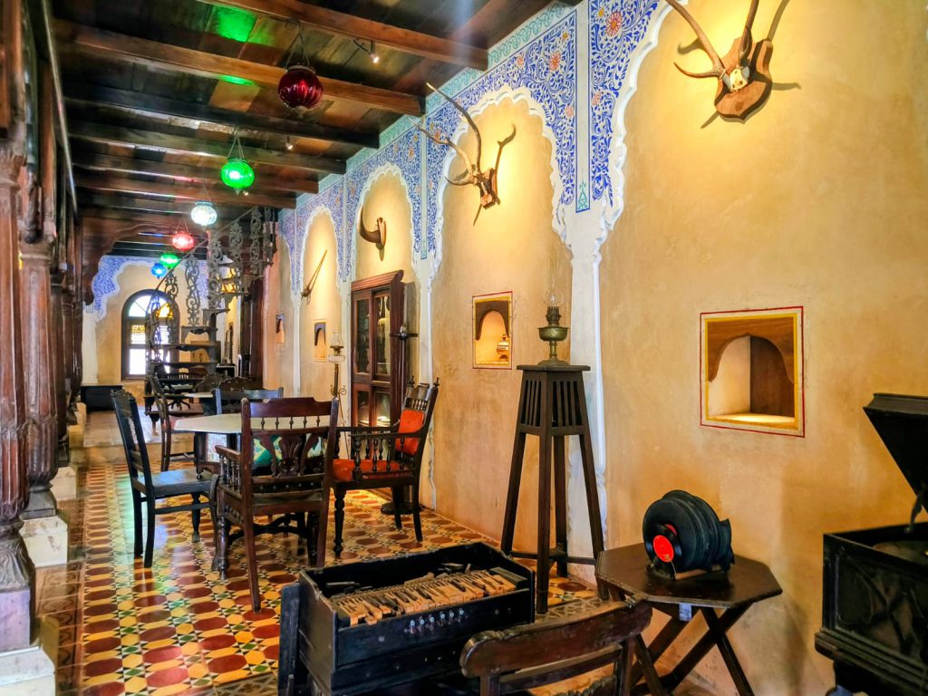 One highlight was the Deccani Nawab Mahal, a more than 100-year-old structure. Right in front of the mahal, there is a charming marble fountain ⛲. What makes this place special is that many building materials were imported — German tiles, Austrian chandeliers on the roof, and Belgian glass windows. Inside, the walls display animal horns, which were once hunting trophies of the kings.